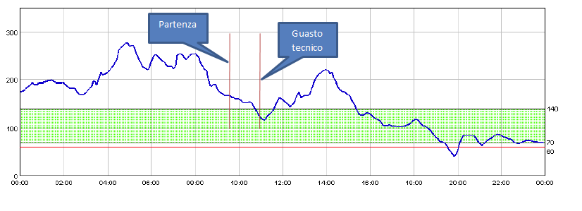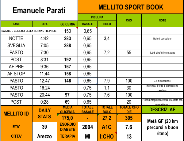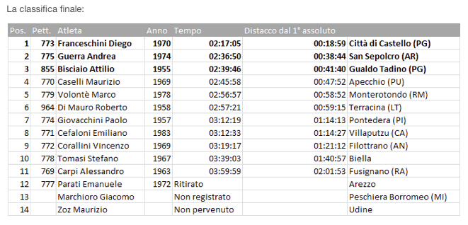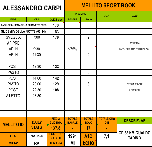 Sono abbastanza soddisfatto della gestione metabolica e nutrizionale del pregara. La glicemia è stata buona sia nei giorni precedenti che alla vigilia; ben gestita la cena del sabato (ottima, in un locale indovinato e molto accogliente di Gualdo: bravo Attilio anche per questo!) nonostante mi sia fatto prendere un po' troppo la mano dal dessert finale, che mi ha portato ad avere un picco altino nella seconda parte della notte, poi però ben corretto. Alla partenza mi sono presentato con una buona situazione glicemica e pronto per una integrazione alimentare così programmata (poi però attuata solo in parte per i problemi che ho avuto a partire dal 16° km): barretta di muesli ai frutti di bosco (tot. 21 gr cho) da dividere in due; primo pezzo al via, secondo pezzo al bisogno (non completata). pasticca enervit da 4gr da assumere 1 ogni 30' di gara. Solo 1 utilizzata.