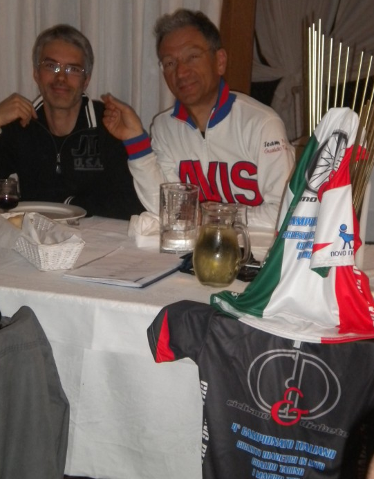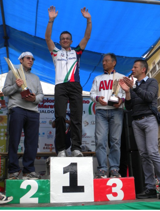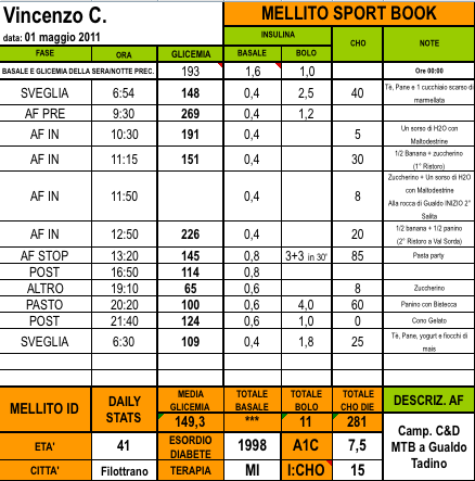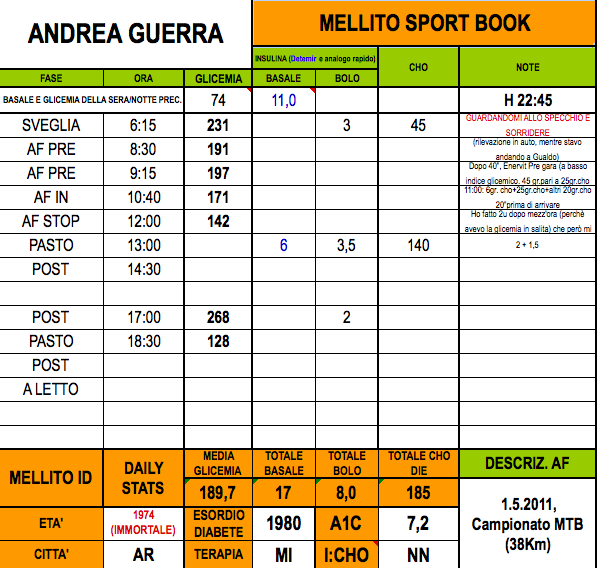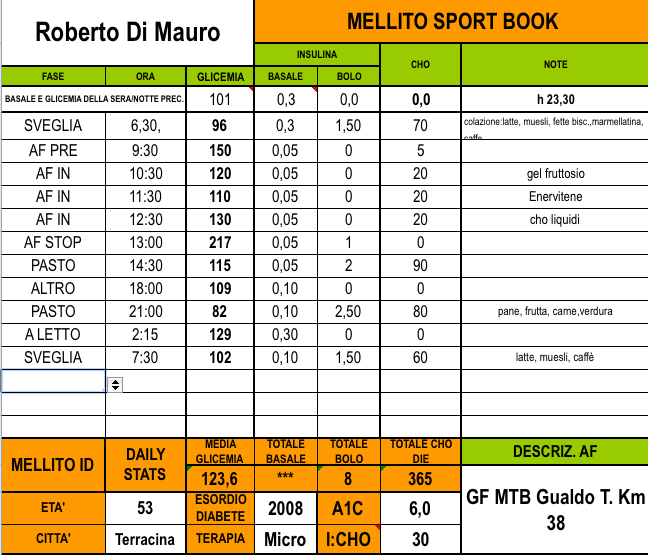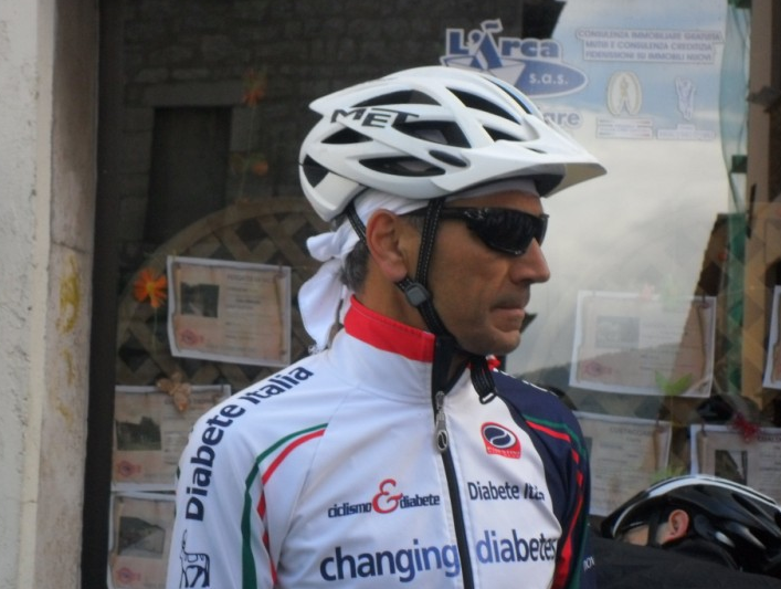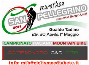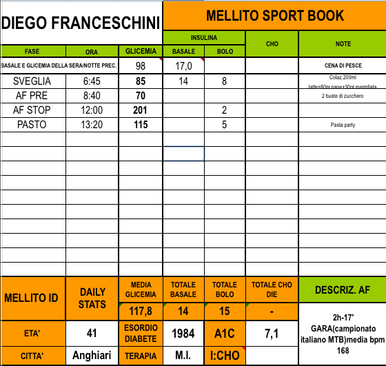 ad accrescere la consapevolezza dell'utilità di questi "raduni" che, a parte l'aspetto agonistico, si stanno sempre più trasformando in occasioni di svago, divertimento, scambio e confronto di opinioni; in altre parole, in momenti di crescita.Un saluto caloroso a tutti; l’appuntamento è ai prossimi eventi di C&D e alla prossima edizione del campionato MTB. Attilio 10 righe da Gualdo by Stefano Shrek Tomasi, Dm1, Biella Cari Ciclomelliti ciao a tutti, vorrei iniziare con il ringraziare Attilio che, con i suoi collaboratori, ha permesso che l'evento avesse il successo che ha avuto, bravo Attilio! Vabbè..... io mi conosco bene, e quando dico che vado piano in salita non è certo per bluffare..... Dopo una partenza a razzo, e devo ammettere che in quei pochi chilometri prima dell'imbocco della prima salita mi sono divertito molto, è iniziata la solita "solfa": la catena che scende sul rampichino, i biker più "cazzuti" che mi passano, poi mi passano quelli meno "cazzuti", poi i bambini, i disabili e per finire mi sorpassano facendo il moon walk anche i paracarri...... Dopo la fantastica cena, ottimi piatti, bello il posto e buono il servizio, la glicemia del mattino non è stata delle migliori, 220 alle 6,45 ma, con una colazione leggera e una unità in più di rapida ci ho messo una pezza.... 160 alla partenza, per finire con 135 al traguardo dopo le soste ai ristori (tanto avevo tempo....) Ma torniamo alla gara.... La prima discesa l'ho trovata un pò troppo facile e veloce e per questo pericolosa, specialmente per il fondo con poco grip, poi il mangia e bevi, poi il calvario.... la seconda salita l'ho trovata un tantino dura, meno male che verso 3/4 di salita ho fatto conoscenza con una bella biker che come mè stava salendo un pò a piedi e un pò pedalando alla volta del GPM. Dopo gli ennesimi 5 minuti passati al ristoro e un tratto di tracciato in compagnia della bella ciclista mi sono ricordato del motivo per cui vado in MTB.... vale a dire: il cercare di farmi del male in discesa. La seconda discesa l'ho trovata fantastica, specialmente quando ho avuto la fortuna di poter fare il tratto finale di discesa a ruota di un Elite (credo Cattaneo) e, quando alcune persone, credendo fossi uno della Marathon mi incitava dicendoni " VAI.. VAI... CHE SEI SESTO" ho goduto molto.... a all'arrivo, quando sono stato accolto da tutta quella gente che si agitava urlante mi sono commosso. < solo in un secondo tempo ho saputo che mi urlavano: LEVATI DAL PERCORSO CRETINO!!!....... Purtroppo, ho fatto un errore logistico che un veterano del diabete non dovrebbe fare, e cioè: ho lasciato l'insulina in macchina nel parcheggio sotto casa di Attilio e, visto che la stanchezza era tanta, il tempo stringeva e la fame era molta, ho mangiato al pasta party senza farmi "la pera", il risultato? 390 di glicemia post prandiale, risolta con un bolo di rapida alle 15,30. alle 18,00 avevo 50 e prima di coricarmi 103. Tutto okay! Grazie a tutti, complimenti a Diego per il risultato e i piazzamenti di Andrea, Attilio e Maurizio, è stato come sempre un piacere e un onore essere stato con tutti voi Ciclomelliti che non siete altro..... A presto, Stefano Shrek Tomasi ![]() Fabio Shrek Tomasi in contemplazione ... sullo sfondo, in dissolvenza, un biker in lieve sovrappeso ... Shrek al confronto è asciutto come un chiodo! 10 RIGHE DA GUALDO TADINO BY DIEGO FRANCESCHINI, DM1Gualdo Tadino....?,un paese che fin'ora ricordo con molto piacere,visto che e' il 3° titolo italiano che metto in bacheca. Aspetto agonistico a parte, e' stata una bellissima manifestazione in tutto e per tutto,ottima l'idea di affiancare il nostro campionato a quello degli elite e dei master teseerati FCI. Grande visibilita' e grande interesse da parte del pubblico verso la nostra associazione e le nostre iniziative...si leggeva dalla faccia delle persone presenti al nostro arrivo e durante la cerimonia delle premiazioni. ATLETICAMENTE: La gara e' stata per me' un grande successo al di la' delle mie aspettative,con un tempo di 2h-17' per coprire il tracciato sono arrivato 10° assoluto nella graduatoria finale ed ho vinto il 3° campionato italiano MTB.Sono partito subito davanti ho gestito la prima parte "spendendo poco" poi dall'inizio della salita di valsorda ho iniziato a spingere al limite fino alla fine impiegando meno di 1h dal passaggio dalla rocca fino all'arrivo. METABOLICAMENTE: Con un valore di 70 30'prima della partenza,ho preso 2 bustine di zucchero,poi durante la gara solo acqua ,2 gel energetici ed 1 barretta.Sono arrivato con la glicemia a 201 ed ho fatto subito una correzione di 2u,poi doccia e pasta party (pre-pasta party 171) NUTRIZIONALMENTE: Ho fatto l carico dei carboidrati nei 2 giorni pre-gara,poi la mattina della gara colazione con fette biscottate,miele,marmellata latte e caffe' con cereali e muesli,1 espresso prima della partenza,poi durante la gara come riportato sopra. MENTALMENTE: Un po' di apprensione pre-gara, poi dal momento del via fino all'arrivo sono stato totalmente concentrato sulla gara,lo sforzo,le sensazioni glicemiche e su dove passare per non avere incidenti meccanici,forature ecc..,e gli ultimi 100mt. finalmente la liberazione per aver portato a termine una bellissima prova a braccia alzate circondato da un pubblico meraviglioso. DEDICO QUESTA VITTORIA ALLA MIA COMPAGNA SERENA CHE MI HA SEGUITO DURANTE TUTTO IL WEEK-END,MI SOSTIENE,MI SUPPORTA E SOPRATTUTTO SOPPORTA TUTTO L'ANNO...GRAZIE!!! Ringrazio tutta l'AVIS di Gualdo per l'organizzazione impeccabile e sopratutto ATTILIO per il superbo lavoro svolto con eccellenti risultati,per l'ospitatilita' in questo bellissimo evento. Diego ![]() Diego Franceschini ... vittoriosamente .... 10 righe da Gualdo Tadino by Roberto Di Mauro, Terracina, DM1 Atleticamente ho sofferto molto sulle pendenze superiori al 15% perchè la gamba non era de lle migliori a causa di recenti infortuni, le discese poi erano forse ancora peggiori a causa dell'eccessivo mio istinto