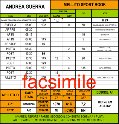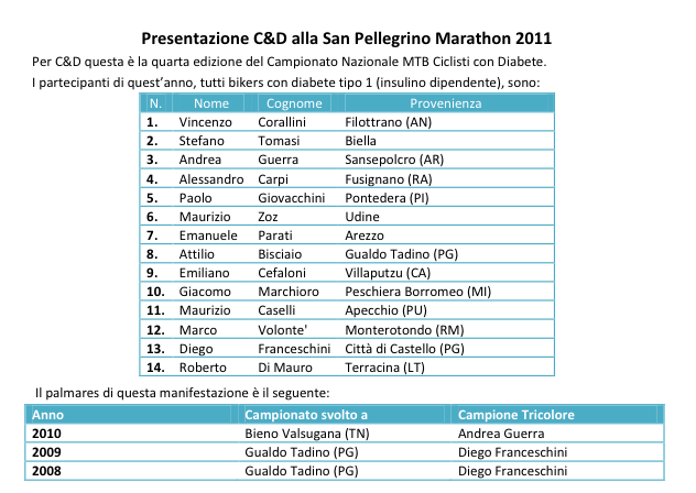 ![]() ![]() CAMPIONATO 2011 MTB, GUALDO TADINO - 1 MAGGIO www.ciclismoediabete.it ultimo aggiornamento 13 maggio 2011 @ 02.55 CICLOMELLITO RANKING ![]() ![]() Podium Ciclomellito: 1. Diego Franceschini a braccia alzate 2. Andrea Guerra con Coppa e Bandanna di Berlusconiana memoria (?) 3. Attilio Bisciaio + A dx, plaudente, Maurizio Caselli. BREAKING NEWS Ottima prestazione dei mellito-bikers a Gualdo Tadino. Vince in solitaria Diego Franceschini che ha ottenuto anche un ottimo 10° posto assoluto. Secondo classificato l'imperterrito e mai domo Andrea Guerra. Terzi a parimerito Attilio Bisciaio e Maurizio Caselli. Presto pubblicheremo la classifica ufficiale finale! Convivialmente ... Emanuele, Attilio e le ambitissime maglie C&D A seguire, le riflessioni dei protagonisti e ove applicabile i dati metabolici! ![]() 10 RIGHE DA ... GUALDO TADINO ![]() I partecipanti sono invitati a trasmettere pensieri, emozioni e riflessioni a schema libero o per punti (atleticamente, metabolicamente, nutrizionalmente, convivialmente e chi più ne ha più ne metta ...) secondo la collaudata formula delle 10 righe da ... Alleghiamo link per scaricare il modulo excel per la raccolta dei dati metabolici Mellito Sport Book EMAIL: mtb@ciclismoediabete.it 10 righe da Gualdo by Emiliano Cefaloni, DM1 Il week end trascorso a Gualdo Tadino in occasione del “Campionato Nazionale MTB C&D” è stato semplicemente straordinario. E’ stata una bellissima esperienza; ho conosciuto tante persone con le quali mi sono trovato molto bene e ho terminato la gara raggiungendo quindi anche il mio obiettivo sotto il profilo sportivo. Il week end è stato allo stesso tempo un’occasione di svago e di crescita. Per quanto riguarda la glicemia in gara non è stata delle migliori, ma parlando con diversi atleti tutti mi dicevano che al 1^campionato nazionale pochi hanno tenuto una buona glicemia. Alla partenza un bel 300 ed in cima al Monte Penna 250 e quindi qualche crampo. Di lì in poi tutto bene. Ho dovuto integrare a metà del Valsorda (glicemia 150 in calo vistoso) con 20g di CHO. All’arrivo glicemia a 130 e tanta soddisfazione. Devo ringraziare tutti i partecipanti per i bellissimi momenti trascorsi; in particolare un sincero ringraziamento ad Attilio per la grande ospitalità e per tutto quanto organizzato meravigliosamente. Un particolare ringraziamento anche a Roberto che mi ha dato preziosi consigli e ha sopperito alle mie dimenticanze!! Spero di partecipare presto a nuovi eventi di C&D, in particolare il mio obiettivo per il 2012 è di partecipare alla tappa del “Giro”; faccio un enorme “in bocca al lupo” a tutti i partecipanti di quest’anno… raccontate, raccontate... vi seguo e tifo per voi!! Saluti a tutti!!!! Dalla Sardegna, Emiliano. 10 RIGHE DA GUALDO TADINO BY ANDREA GUERRA, DM1, ARHo partecipato un solo giorno al ritrovo dei bikers melliti organizzato a Gualdo da Attilio ma sono rimasto soddisfatto e mi sono molto divertito. La mia soddisfazione è dovuta al condiviso entusiasmo che ho respirato nel gruppo sempre più numeroso di partecipanti. Relaziono sotto brevemente la gestione di questa corsa che atleticamente ho affrontato spalmando lo sforzo su tutti i suoi duri 38 chilometri. Nelle ore precedenti la partenza ho scelto di non aumentare l'insulina, anche se al risveglio avevo valori abbastanza alti: ho lavorato con la dieta, riducendo i gr. di cho della colazione. Dopo essere partito per pedalare senza spingermi al massimo, durante il bellissimo percorso della corsa mi sono gestito bene a livello metabolico: ho viaggiato dai 150 ai 200 mg/dl. Un pò peggio a livello nutrizionale, con un'ultima integrazione a 20 minuti dall'arrivo che mi ha fatto arrivare con un buon valore glicemico il quale però era in salita. Grave l'errore che ho fatto poco dopo, prima del pranzo: 2u. di rapida per timore di arrivare a tavola alto, mi ci hanno fatto arrivare purtroppo con una ipo. Prima di chiudere, sento il dovere di ringraziare il buon Attilio per l'ottimo lavoro organizzativo e l'Avis Gualdo che ha dimostrato sincera attenzione e sensibilità nei nostri confronti. A presto. Sansepolcro-Gualdo Tadino, 6 maggio 2011. Andrea Guerra 10 RIGHE DA GUALDO BY PAOLO GIOVACCHINI, DM 1, PISA Sono il nuovo entrato nella grande famiglia, Giovacchini Paolo. Per me è stata una bella esperienza ,devo fare i complimenti ad Attilio per l'organizzazione ,tutto perfetto , soddisfatto della gara e della gestione glicemica, dopo una cena del genere la glicemia era a 190 compreso il dessert che si struggeva da solo in bocca. Mattina risveglio 180, 5 unita di insulina rapida, prima della partenza 155, barretta energetica prima di partire è via a tutta dietro a questi "ghiavoli", detto alla toscana, frutta ai ristori, una barretta e una bustina di glucosio liquido in gara, glicemia all'arrivo 170, pasta party con 8 unità, nel tardo pomeriggio ho mangiato qualcosa perchè la glicemia stava calando. Ringrazio tutti per questa 2 giorni … dimenticavo bellissima la seconda parte in discesa,la salita è sempre dura. Signori, attenzione, l'anno prossimo ho la possibilità di allenarmi di più vi faccio mangiare la polvere a tutti. Ciao a tutti. Alla prossima … è la prima volta: pubblicate queste 10 righe. Grazie. 10 righe da Gualdo by Attilio Bisciaio, DM1, PG Le mie 10 righe voglio spenderle soprattutto per ringraziare tutti i partecipanti alla due giorni di MTB per le belle parole che mi hanno dedicato, grazie di cuore a tutti.