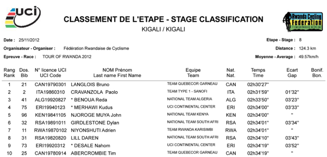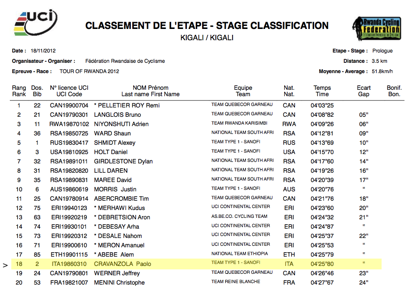 THE AFRICAN JOB Paolo Cravanzola @ Tour de Rwanda 2013 18-25 novembre 2012 Paolino Cravanzola (t1 • Torino) debutta in una gara "pro" al di fuori del circuito statunitense. Dal 18 al 25 novembre si corre il Tour de Rwanda. 1 prologo e 8 tappe per un totale di 890 km La voce del protagonista ... Pro-Paul racconta! Postato da Alicante (ESP) il 19 dicembre 2012... @ Team Novo Nordisk! ![]() Paolino @ Team Novo Nordisk ... il 2° da dx della fila in alto ... il più bello? :-) Con debito ritardo, voglio aggiungere due righe al fantastico lavoro che il Presidentissimo ha già svolto raccogliendo qua e là informazioni sulla gara ruandese. Voglio innanzi tutto ringraziare tutti coloro che mi hanno sostenuto a distanza; come si è capito dai brevi messaggi via facebook, il mio peggior nemico si è poi rivelato quello che più temevo: i problemi intestinali! Pur facendo attenzione all’acqua e a tutti i cibi non cotti, un ancor sconosciuto batterio mi ha costretto ad iniziare una cura antibiotica e a ricorrere all’ausilio di una massiccia dose di imodium per poter continuare a correre: è una di quelle occasioni in cui l’obiettivo a breve termine e’ continuare la competizione, sperando che la forma migliori nei giorni seguenti e il tempo del riscatto finalmente arrivi. E così è stato. Nell’ultima tappa, complice la richiesta di Phil di sentire il mio nome pronunciato alla radio della corsa, sono andato via in fuga al primo km, raggiunto dopo un paio di minuti da altri 3 corridori con i quali ho collaborato quasi fino alla fine. Nella prima salita di circa 10km, con pendenze intorno al 4%, non siamo mai scesi sotto i 40km/h, cosa che ci ha permesso di arrivare in breve tempo sopra i 3 minuti di vantaggio e quasi a 6 minuti a metà gara. Nel finale purtroppo il Canadese, che con una valutazione a freddo posso tranquillamente ammettere fosse superiore a tutti noi, se n’è andato in solitaria. Io, dopo essermi tolto il francese di ruota, ho “atteso” l’algerino, data la sua promessa di non attaccare e di lavorare nel momento in cui sarebbe stato in grado. Ovviamente la promessa, non appena cominciato il penultimo strappo sul pavè, è stata disattesa; ma a metà salita, vedendolo nuovamente in difficoltà, ho deciso di ripagarlo della stessa moneta. Attaccando sul lato opposto della strada, tra due ali di gente urlante (il numero di persone che venivano a vederci, specialmente nella capitale Kigali, ha dell’incredibile), me ne sono andato, con un vantaggio di circa un minuto all’atto dello scollinamento. Da lì alla fine ricordo solo le gambe doloranti, il fiato corto, e Phil sull’ammiraglia vicino a me che mi diceva di scavare a fondo nelle mie energie. L’ultimo strappo era un km a circa il 18% medio: è stato un calvario, ma allo stesso tempo sapevo che la tappa stava finendo. Gli ultimi 3 km infine, ho solo pensato a controllare che non arrivasse nessuno e a godermi lo striscione d’arrivo. Tra le varie interviste fatte a fine gara poi, la più curiosa è stata di una tv sudafricana, particolarmente interessata a come gestissi la mia condizione in gara e di come, nonostante diabetico, fossi riuscito ad arrivare fin lì. Mentre completo questo commento post experience, sono appena tornato dal primo training camp in Spagna, ad Alicante, con la nuova squadra Professional con la quale avevo firmato qualche mese fa. Il nome è “Team Novo Nordisk” (www.teamnovonordisk.org) che lascia intendere quale sia il principale sponsor, nonostante la sponsorship sia solo nel progetto di Changing Diabetes che condividiamo, e non direttamente con l’azienda. Ho appena conosciuto corridori e staff con cui passerò la prossima stagione, e vi posso assicurare che ci attende un progetto stupendo. Soprattutto dal punto di vista diabetico, saremo seguiti e studiati a fondo: spero quindi di poter condividere con tutti voi alcune “scoperte” fatte dal nostro team. Colgo infine l’occasione di scrivere queste poche righe, per augurarvi tanti auguri di buone feste!!! Maya permettendo, a risentirci il prossimo anno. Paolo Paolino scatenato ... 2° a 1'35 dal vincitore. In classifica generale chiude al 32° posto! CLASSIFICA GENERALE ![]() ![]() Dalla pagina FB di Paolino: "Giornata fantastica. In fuga dal primo km da solo, raggiunto da altri 3 due km dopo. 108 km di fuga, con massimo vantaggio di circa 6 minuti. Il canadese attacca a 17 dall'arrivo e se ne va. Io attacco sulla salita in pavé a meno 10, e prendo un minuto di vantaggio sull'algerino che mi era rimasto a ruota fino ad allora. Nel finale continuo a fare il mio passo ma nn riesco a riprendere il primo. Comunque estremamente felice del mio primo secondo posto in una gara a tappe UCI. Da Pane e Gazzetta: "L’eroe della giornata è Cravanzola. "L’algerino - racconta - ha chiarito subito la sua posizione: io non collaboro, perché della mia squadra non sono io a dover vincere la tappa, però giuro che non attacco e non faccio la volata. Così a tirare eravamo in tre, e io forse ho fatto anche più degli altri perché la fuga arrivasse al traguardo. Il canadese ha approfittato di un buco creato proprio dall’algerino, a -18 dal traguardo, aveva gambe, e se n’è andato. Poi Menini, esausto, si è staccato. Sul pavè, invece di starsene tranquillo come aveva giurato, Benoua ci ha provato e allungato. Io non mi sono impaurito, l’ho ripreso e staccato. In cima al muro avevo un minuto su di lui e mancavano tre chilometri al traguardo. Alla fine: secondo. Il mio migliore risultato in una corsa internazionale. Felice". TAPPA 7 > sabato 24 novembre 2012 > Rubavu / Kigali • 156 km - 2218 d+ Per Paolino una tappa in difensiva chiusa a "ritmo controllato". Oggi 36°, arrivando a 28 minuti dal vincitore, in compagnia dei compagni di squadra @ TT1. In classifica generale 34° a 50' dalla maglia gialla! Dalla pagina FB di Paolino: 30km di salita, e 30 di discesa, arrivato in volata con il gruppo di testa. Oggi (24 novembre) l'ultima t