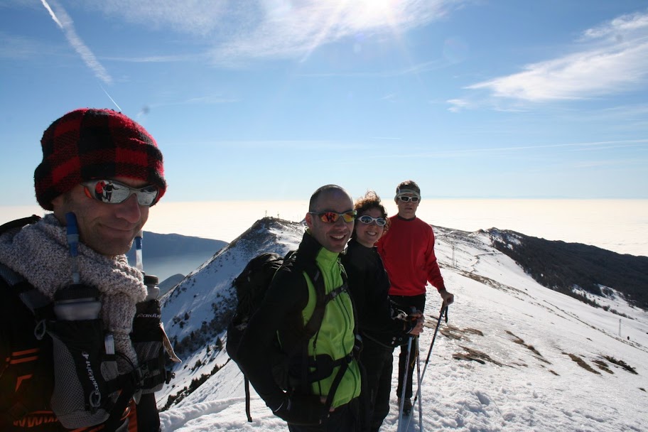 ![]() A spasso tra i sentieri del Paterno Monte ... Che Spasso! ![]() Il cielo è blu sopra la nebbia! by Andrea Veggy Verzura Nebbia al risveglio … nebbia in viaggio … nebbia sotto di noi. Sole che ci aspetta… sole che ci accompagna … sole nelle nostre facce soddisfatte. Una giornata in compagnia alla caccia di un angolo di cielo che non sia grigio. Ci siamo trovati in 12 in fuga dall'uggiosa pianura per evitare di passare il tempo a mangiare davanti alla tv o in coda per i saldi... e siamo stati ripagati da un cielo azzurro, da un mare di nuvole fino all'orizzonte, da quinte di monti con le cime bianche. e poi, salendo pian piano, anche da una neve un pò sfatta (per la stagione) ma che ha fatto da ammortizzatore per alcune ginocchia dolenti. Il posto, nuovo per molti, ha conquistato ... e già c'era chi parlava di tornarci in estate o già quest'inverno a provarlo anche con gli sci in escursione. Posto non troppo frequentato, gestori del rifugio veramente "genuini" ( o ruvidi...vedete voi), tanti scivoloni sul ghiaccio, progetti, nutrizione, allenamenti, vacanze, diabete, infortuni... e soprattutto persone! un bel mix per una giornata riuscita. ![]() Lunchbreak @ Fiori del Baldo ... pranzo al sacco per alcuni, per altri un panino nel caldo rifugio dalla scorbutica ma simpatica gestione montanara. Il montanaro del Baldo ha una caratteristica genetica: è ostico ma buono. Qui sono tutti stranieri appena si presentano sull'uscio, ma rotto il ghiaccio si diventa amici! Adriano, annota l'ordinazione di cui forniamo originale: ![]() Descrizione Percorso by Cristian km 13,5 - d+ 700 ca Itinerario panoramico e di facile percorrenza. Tempo di percorrenza ad andatura tranquillissima: 5 ore (pause escluse) Partenza a quota 1280 mt in loc. Pozze di Prada (Pozze di Pralongo). Dal pianoro delle Pozze procediamo per jeepabile ondulata in direzione sud est lungo il sentiero 51 fino a intersecare, superato il Dosso dei Cavalli, il nr 64. Splendida vista su Malga Zocchi. Sempre per carrareccia e saliscendi nel sottobosco si cammina fino a incrociare il sent. 662 che dopo poche centinaia di metri devia sulla sinistra puntando deciso a nord e diventando single trek. Qui è tutta salita che percorre il vallone tra le Creste di Naole e il Monte Sparavero. A punta di Naole (1550 mslm) è possibile proseguire per l'omonimo forte oppure deviare sul versante occidentale risalendo sullo spartiacque a quota 1600 ca e procedendo in cresta sopra Costabella. Vista a 360° gradi. A sud gli Appenini. A occidente le prealpi bresciane, il Gruppo dell'Adamello e nelle giornate più limpide Monviso e Monte Rosa. A oriente vista su Ferrara di Monte Baldo, Monte Cucco e Monte Cor, Lessinia e gruppo del Carega. Dritto davanti a noi, innevatissimo, il Coal Santo (2072 mt slm) caratteristica cima della dorsale Baldense. Poco più sotto i due rifugi (Fiori del Baldo e Chierego) rispettivamente a quota 1850 e 1930 mslm. Punto tappa ai Fiori del Baldo (percorsi 8 km) e dunque giù per il versante orientale correndo nella neve lungo le strutture della seggiovia fino a Rifugio Mondini 1500 mt slm. Da qui prendere a sinistra e seguire l'ampio sentiero 51 che per saliscendi porta ai Baiti di Ortigara, attraversando malghe e alpeggi. Al bivio con la Val di Sacco che scende a Prada, si prosegue sulla jeepabile nella faggeta fino ad incrociare, superata una sbarra, la strada di Naole che su fondo cementato in circa trecento metri ci riporta al punto di partenza. ![]() Dorando Baldo Book ![]() Veggy Baldo Book ![]() Vale Baldo Book ![]() Issimo Baldo Book ![]() Valeria, Alberto, Laura ... work in progress ![]() |