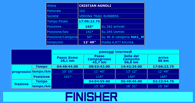 7a partecipazione a un ultra … 4 finiti, 3 non terminati. Per lo meno il conto ora è in attivo, ma altri sono i numeri e diverse le soddisfazioni che ricerco da questo tipo di esperienza sportiva.