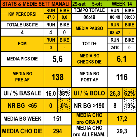 W2 [7>13 LUGLIO 2014] > [clicca sullo specchietto riepilogativo per visualizzare il diario completo] Sto dedicando un po' più di attenzione agli aspetti metabolici, senza peraltro riuscire ad evitare qualche iper (e non solo) di troppo. Il tutto anche in virtù del perfezionamento del foglio elettronico per la raccolta integrata di dati metabolici, terapeutici, nutrizionali e atletici. Sono però in controllo e so cosa devo fare per migliorare. Ho inserito qualche statistica riepilogativa in più, in particolare la % di glicemie inferiori a 65 e maggiori a 190 sul totale delle rilevazioni e la media delle integrazioni sia sul totale degli allenamenti, sia pro ora di attività . Roba da "smanettoni", e con i limiti di tutte le medie/statistiche, ma cerco di raccogliere il maggior numero di dati "utili" (atletici e metabolici) e di metterli assieme senza perderci troppo tempo (alla fine è come tenere un diario unico di tutto, quindi non debbo fare trascrizioni o ricopiamenti vari perditempo): ogni volta che li rileggo, ne traggo ispirazione e stimolo. A me poi tradurre l'analisi in reale "miglioramento" o restare a livello di "conversazione". Atleticamente ho gestito una settimana con lavori più vari e un po' più brevi (meno di 50 km e meno di 2000 d+ complessivamente). Avrei voluto un po' più di velocità nelle ripetute in salita, ma tutto sommato ho svolto 12 workout in 14 giorni. Non debbo avere fretta. Fortunatamente riesco a ritagliarmi quasi quotidiani, piccoli o medi spazi, per allenarmi con regolarità . L'estate tarda ad arrivare, e questo aiuta a gestire le uscite anche in pausa pranzo. Non posso dedicarci tutte le "ore" che vorrei, ma non sono mica un "professionista". Per l'UTLO di ottobre mi basta di riuscire a inserire un lungo ogni 15/20 giorni. La buona forma fisica si riflette anche sulle velocità ascensionali, sia a piedi, sia sui pedali. Avverto tanta voglia di correre, un entusiasmo forse eccessivo, che mi porta ad allenarmi con piacere ma che forse non è consono alla mia età e a un buon pater familias.