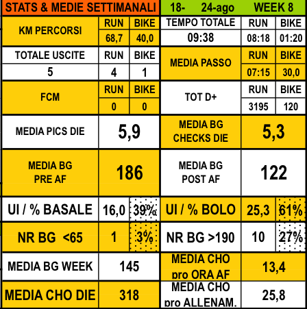 Metabolicamente sono partito male, ma ho poi trovato il tempo di fare un attimo il punto riguardando i dati certosinamente raccolti e ho fatto F5, ovvero reload, e mi sembra di essermi rimesso in carreggiata, anche se le medie e le statistiche, per tornare a parlare bene di me, necessitano di qualche altra settimana. Ho fondamentalmente usato una terapia più intelligente e aggressiva, ovvero insulinizzazione ai pasti più aggressiva e decisa, e quando serve, bolo combo per coprire risposte glicemiche a scoppio ritardato da pasti non equilibrati o da ripassi vari di cibo, ora non più a mia insaputa, ma consapevoli. In attività fisica sono riuscito finalmente, a parte i primi due workout, a gestire glicemie quasi sempre entro i range, senza picchi su e giù, e integrando in linea con le mie previsioni (ovvero un po' più nelle prime e più intense ore di allenamento, e limitandole nel finale, solitamente in discesa e dunque meno impegnativo muscolarmente ed energeticamente) .