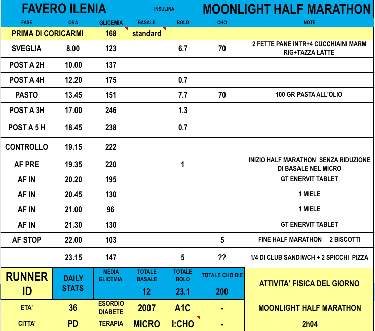 ![]() Ilenia racconta la sua partecipazione alla mezza di Jesolo ... il Team DNL in rosa, piano, piano, esce allo scoperto! Raccontarsi, raccontarsi, raccontarsi! SITO GARA > LINK INTRO MOONLINGHT by Elisa Basso, DM1, PD ![]() Da sx a dx: Elisa, Ilenia e Pedro Sabato 12 Maggio è stata organizzata dalla VeniceMarathon Club in collaborazione con i comune di Jesolo e Cavallino Traporti la Moonlight Half Marathon. Il percorso di 21,097 Km collega i comuni di Cavallino Treporti e Jesolo. Partenza alle 19.45 dal lungomare di San Felice a Cavallino . Dnl c’è nella persona di Ilenia Favero che affronta la distanza dei 21 Km per la seconda volta. L’accompagnano il fedelissimo “personal trainer” Pedro e la sottoscritta che a causa di qualche acciacco quà e là rinuncia a fare la mezza e l’attende impaziente al 10Km per supportarla fino al traguardo. La serata è calda ma piacevole , il percorso veloce e a tratti a mio avviso veramente regala paesaggi incantati , specialmente quando si costeggiano i caratteristici canali veneziani con le piccole imbarcazioni e reti da pesca degli abitanti del Cavallino. E’ proprio qui’ che decido di attenderli. Puntuali arrivano e in un batter d’occhio fra una battuta , una risata e il dovuto incoraggiamento alla nostra Ile (stanca, ma tenace come sempre) arriviamo nel centro Jesolano affollato di persone che passeggiano e ci incitano. Esperienza positiva come sempre fatta di sport e amicizia (mancava solo il briefing!) ed ora resocontazione. Speriamo l’anno prossimo di vedere qualche faccia nota in più. IL MIO COUPON ALLA MOONLIGHT HALF MARATHON DI JESOLO di Ilenia Favero, Dm1, PD Sono soddisfatta del mio risultato, più di così ieri non riuscivo a dare: ho fatto parecchia fatica a finirla. Ero molto debole e prendendo due antidolorifici ancora sentivo dolore, però il fato ha voluto così e così l'ho affrontata. Ieri a pranzo ho mangiato pasta pesata senza sughi e ho avuto l'ennesima conferma dell'innalzamento della glicemia pregara. Parlandone anche con i ragazzi mi dicono che sia dovuto soprattutto dalla tensione della gestione dei carboidrati e glicemie in gara. Oggi non ho ne dolori alle gambe, ne affanni dovuti alla corsa, vorrei quasi quasi provare un altra mezza fra un mese o due. Le gambe proprio non giravano, poi quando al 12 km ho sentito che non riuscivo a tenere neanche il mio tempo normale mi sono purè inca.... con me stessa. Comunque sono soddisfatta ... soprattutto della gestione metabolica della gara e degli amici che avevo intorno e dell'affetto che ho sentito da tutti. ATLETICAMENTE > Ho compreso da poco come dicevo a Milano, l'importanza della tabella di allenamento, e comincio a sentire adesso cosa sia veramente lo sport. C'era chi mi prendeva in giro ... (un nome a caso ... Pedrollo) quando dicevo che invece di seguirla facendo le ripetute con il Garmin, fartlek, lenti e quant'altro correvo a sensazione!!! A sensazione … che cavolata!!!! Adesso mi vien da ridere ma non avevo ancora capito. Due mesi fa, ho cominciato ad allenarmi in modo metodico, provando dei lunghi, le ripetute, anche se prime non riuscivo a finirle e il resto. A Milano quando ho visto che ho finito i 10km in 53'40 e stavo bene mi sono veramente entusiasmata. Gli allenamenti si intensificavano, uscivo anche al mattino presto, cosa impensabile fino a qualche tempo fa. Dopo aver fatto una competitiva di 10 miglia in 1h'30 ho pensato "ok sono pronta". Sono giunta a Jesolo con una preparazione atletica che non ho mai avuto, avendo l'immensa soddisfazione del mio "best" sulla mezza (sarebbe la seconda) chiudendola in 2h'O4. Bellissimo il percorso, con la partenza in laguna alle 19,45 e via via col calar del buio si accendevano le luci, in alcune piazze lungo il percorso appostati gruppi musicali da allietare gli sforzi profusi, con uno spettacolare arrivo transennato e illuminato in piazza Mazzini a Jesolo. So che avrei potuto fare meglio, mi sono resa conto al 10° km che le gambe non giravano e non era proprio giornata, ma ne sono consapevole e alla prossima vi do appuntamento sotto le due ore, promesso!!! METABOLICAMENTE > Al mattino faccio la solita colazione e il pranzo visto che la gara sarebbe stata di sera lo tardo un pò mangiando pasta olio e grana. Dopo 2 ore la glicemia è a 246, e allora penso cosa posso aver sbagliato....ma la pasta l'ho pesata, al mattino non ho mangiato niente di insolito o di grasso i calcoli sono giusti senza altre variabili presunte. Faccio un bolo di correzione e dopo quasi 2 ore ho la stessa glicemia come non l'avessi fatta. "Ecco, la solita odissea pregara" penso, e allora decido di monitorarmi attentamente per non "cannare" in corsa. Prima della partenza ce l'ho ancora alta e faccio 1 bolo di correzione, la tensione me la sento tutta. Correndo finalmente poi comincia a scendere e così ...un respiro di sollievo!!!! Sono rasserenata dalla conduzione metabolica in corsa, per aver scampato l'ipo e le iper durante, questo mi consapevolizza che sto imparando. La tensione per me è ancora tanto alta tanto da darmi l'ulteriore conferma dello schizzo glicemico. ![]() MENTALMENTE, SOCIEVOLMENTE, AMICHEVOLMENTE > Sono partita da casa con una mia amica, così ci siamo godute anche i preparativi e la convialità dei partecipanti e organizzatori. Ricorderò con simpatia i vigili appostati al campo di partenza che ci hanno "confortato" sul meteo, dicendoci che ci sarebbero stati forti temporali con grandine prima della partenza. "In ciccia alla balena" hanno sbagliato! Mai è stato così coinvolgente!! L'emozione dell'arrivo con i miei nipoti sulle transenne finali che incitavano, Paolo alla fine che mi aspettava per abbracciarmi anche se schifosamente sudata, e il correre in compagnia passo passo con Cristian (Pedro) ed Elisa venuti solo per il piacere di correre insieme e sostenermi. Cosa voler di più dalla vita!!!! Besos e alla prossima Ilenia DNL RIGHEGGIANDO DALLA MOONLIGHT ... BY ELISA BASSO, DM1, PD Atleticamente: Come 